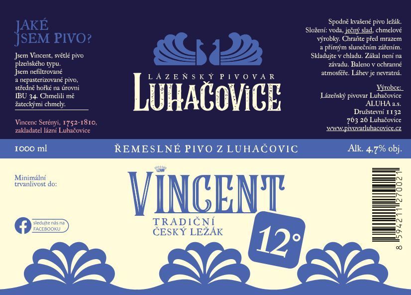 Vincent 12°, Jsem Vincent, světlé pivo plzeňského typu. Jsem nefiltrované a nepasterizované pivo, středně hořké na úrovni IBU 34. Chmelili mě žateckými chmely.