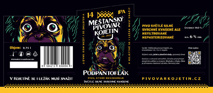 Podpantoflák, Náš první silný ejl světlé barvy s hustou nízkou pěnou potěší milovníky tohoto typu piv. Díky pečlivě vybrané směsi chmelů Simcoe a Lotus, svrchnímu kvašení při vysokých teplotách, a také „dryhop“ v tanku chmelem Equinox vyniká především chutí citrusů, květin a tropického ovoce.
