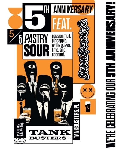 5th Anniversary 5/5 - Salama, 5th Anniversary 5/5 – Salama closes our birthday series with a tropical Pastry Sour brewed at 18° Plato and 5% ABV. Packed with passion fruit, pineapple, white guava, lime, and coconut, it’s a juicy, exotic blend that bursts with sunshine. Tangy and refreshing, yet smooth and creamy, bringing sweet tropical richness balanced by zesty citrus brightness. A celebratory finale that captures the spirit of Tankbusters: bold, playful, and unforgettable.